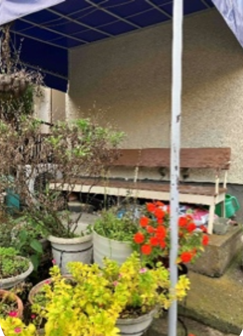 季節の花に囲まれた中にベンチがあり、地域の方がそこに座ってお話しています。